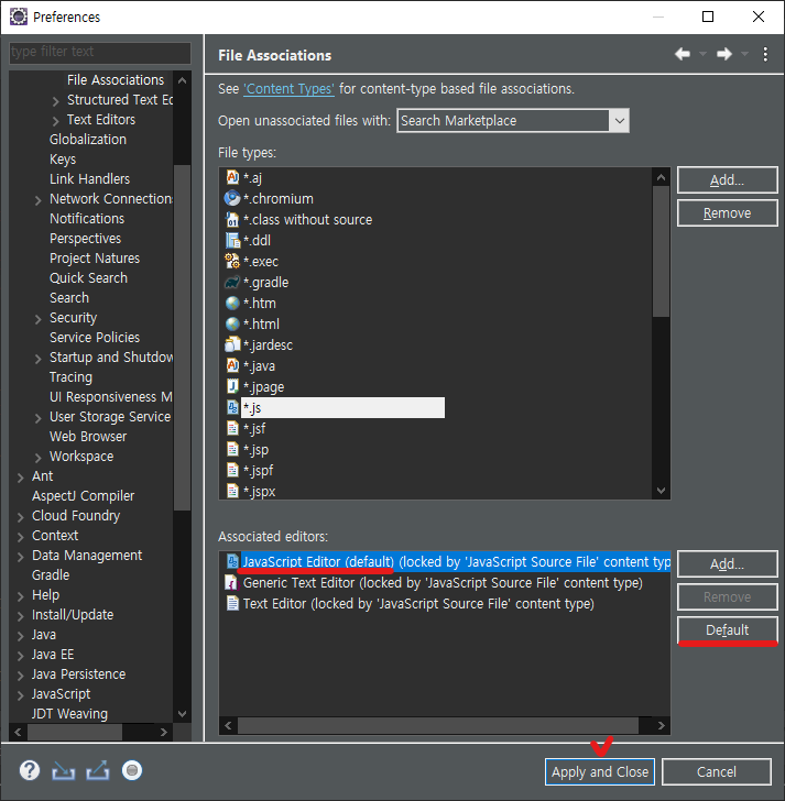 그중에 JavaScript Editor를 클릭하고 오른쪽에 [Default] 버튼을 클릭 - Apply and Close 를 한다.