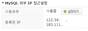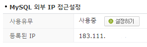 하단의 MySQL 외부 IP 접근설정 부분에서 설정하기 버튼을 눌러 서버아이피를 등록해준다.