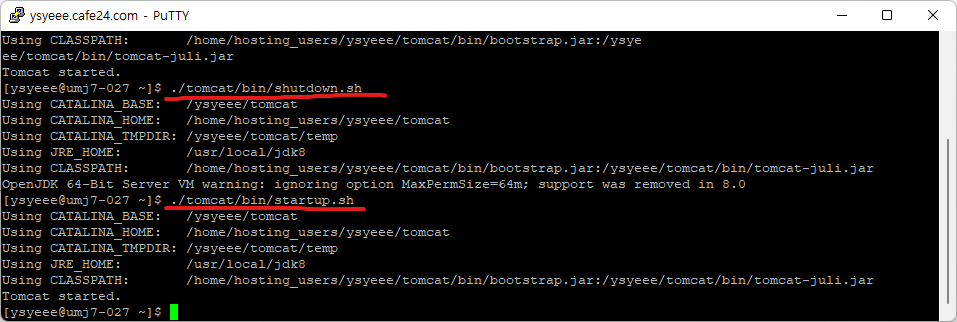 ./tomcat/bin/shutdown.sh 를 입력하면 톰캣 서버가 종료된다.