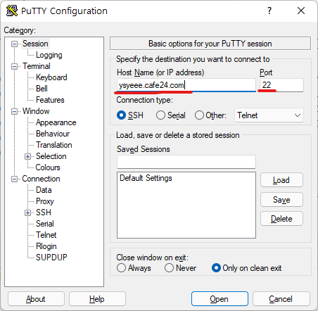 PuTTY를 실행시키면 처음 나오는 창에서 설정해줄 내용은