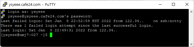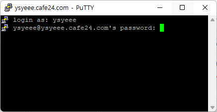 그리고 password를 입력해준다. 역시 cafe24회원 비밀번호가 아닌 FTP에서 사용했던 비밀번호를 입력한다. 입력을 할때 ***같은 입력표시가 나지 않고 아무것도 써지지 않는데, 어쨌든 그냥 키보드로 다 입력하고 엔터를 누르면 알아서 서버가 가동된다.