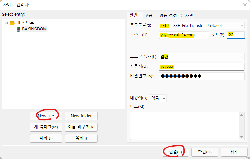 - 비밀번호 : FTP비밀번호 (cafe24 회원 비밀번호가 아닌, 호스팅 신청시 새로 설정한 FTP 비밀번호이다.)