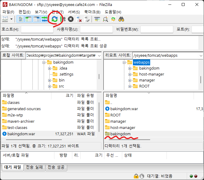 이걸 쓰고 있는 시점에서는 이미 설정을 모두 완료했기때문에 bakingdom.war 그리고 bakingdom이라는 폴더가 리모트사이트쪽에 이미 생성되어 있는데, 처음엔 이런게 없고 기본적으로 manager, host-manager, ROOT 폴더만 달랑 있을 것이다. 아무튼 war파일을 옮겨주고 나도 별로 달라지는 일은 없다.