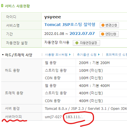 카페24 호스팅센터의 나의서비스관리 페이지를 가보면,