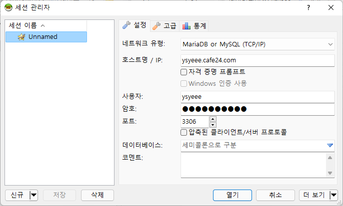 HeidiSQL에서 세션관리자 창을 열고