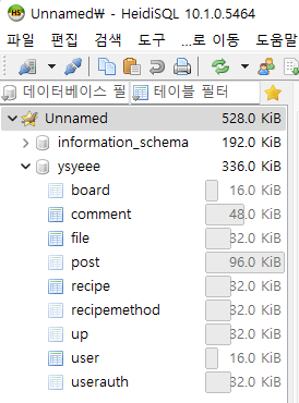 SQL 파일 실행... 메뉴를 통해 한꺼번에 테이블을 설정해주었다.