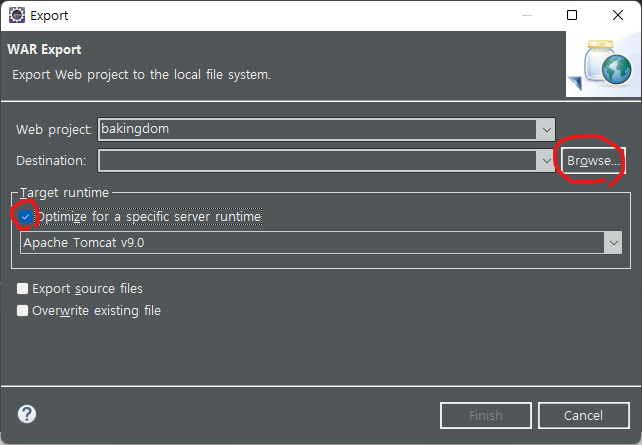 Destination : war파일을 저장할 위치를 선택한다.